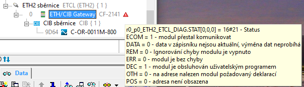 Mám jednotku CP-2000 a k ní jsem přes port ETH2 přímo UTP kabelem připojoval modul pro další CIB sběrnici CF-2141 a na ní modul C-OR-0011M-800. Vše chvíli fungovalo, ale pak mi na modulu přestala blikat kontrolka CIB značící probíhající komunikaci. Tak jsem otevřel Mosaic a v I/O konfigurátoru vidím u ETH/CIB Gateway CF-2141 červený vykřičník. Když na něj najedu, tak mi píše status 16#21 - viz screen. Nevíte, prosím, kde by mohl být problém? Všechny moduly jsem aktualizoval před chvilkou na poslední verzi FW a jednotku restartoval, ale nepomohlo to. Děkuji.