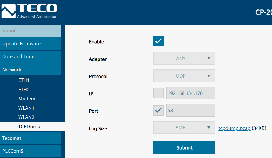 Zde se zaškrtne Enable, Adapter se nechá ANY, protokol UDP, IP adresa se nezašktne, port se zaškrtne a zvolí 53 a volby se potvrdí stisknutím Submit. Ve chvíli, kdy dojde k chybě je možné stáhnout soubor tcpdump.pcap, kde bude problematický paket zachycen. Pokud nám jej zašlete, můžeme se pokusit zjistit v čem problém spočívá.