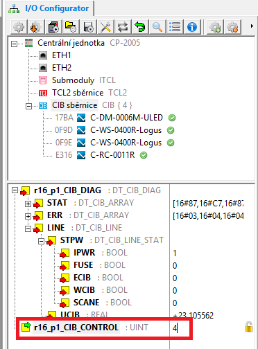 Lze to provést i z uživatelského programu, vyhodnocovat lze rx_py_CIB_DIAG.STAT[i], kde index odpovídá logické adrese modulu v projektu. Správné hodnoty jsou střídavě 16#87 a 16#C7. Naopak, když se centrální jednotka snaží navázat s periferiemi komunikaci, ve statusu bude hodnota 16#90 a zároveň bude vidět, jak se zvyšuje hodnota počítadla chyb v poli ERR. Tu hodnotu je potřeba zapsat jednorázově, na náběžnou hranu, jinak se bude sběrnice stále restartovat. Po zpracování příkazu systém hodnotu nastaví zpátky na 0. Jestliže dochází k výskytu chyb častěji, bude potřeba najít příčinu, ale jen na základě dosud poskytnutých informací ji nedokážu určit.
